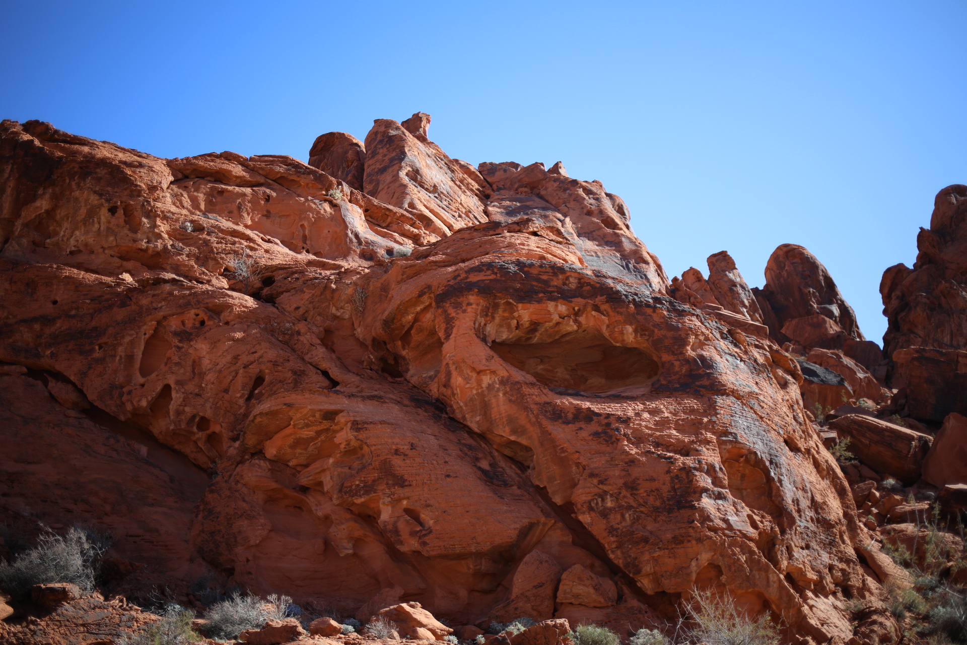 火焰谷是大自然在时间加持下的积累。谁能想到,在恐龙生活的年代,这里也是水草丰美的地方。而如今它荒无人烟,几乎没有植被覆盖,只有那些如同火焰燃烧般热烈的橙红色砂岩里,还保存着曾经生命的痕迹。在数以亿万计的时间里,地壳变迁,风雨雕琢,这里曾经的雨林成为荒漠,大海变幻为山峦。 在做旅行计划的时候,也想过是否直接开车去Grand Canyon,或者羚羊谷,但最终因为担心爸妈过于劳顿而选择了就近的火焰谷。感恩大自然之无尽藏,让我们又体会了不一样的风景。更感恩我又能带着爸妈一起旅行,拓展着属于我们一家人的共同记忆。